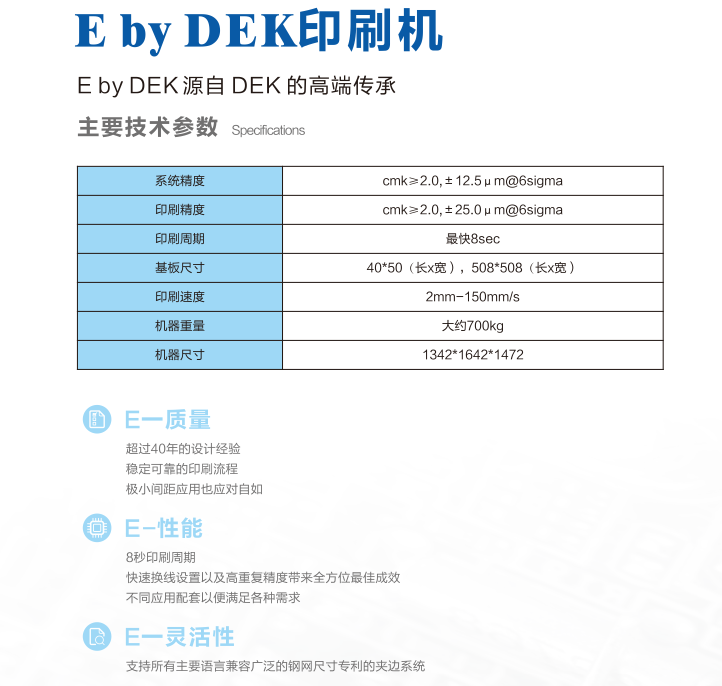 Eby DEK印刷機,歐洲設計,新加坡制造。穩健平臺,品質與技術兼具,易操作界面和容易使用。可靠的印刷質量與重復性能。