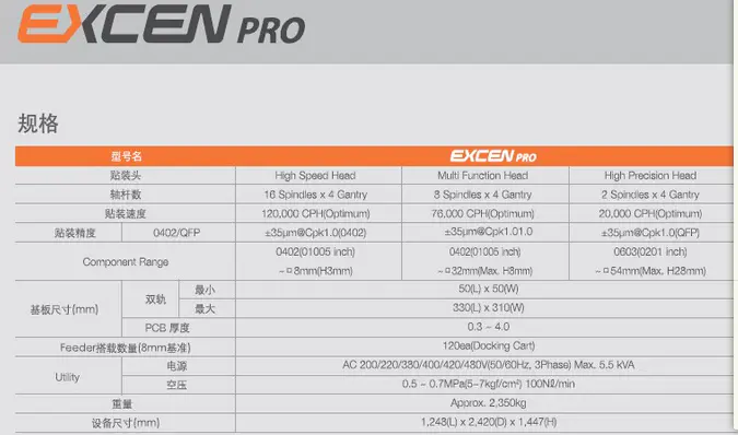 三星貼片機(jī)EXCEN PRO 配有16個(gè)吸嘴,旋轉(zhuǎn)式頭部的高速模塊式貼片機(jī),它實(shí)現(xiàn)了世界同級(jí)產(chǎn)品中的最高速度120,000CPH,也實(shí)現(xiàn)了世界最高的面積生產(chǎn)性。另通過元器件的貼裝前·后的監(jiān)控功能(SVS:Side-view Vision System)確保了微小元器件的貼裝信賴性,通過適用不停線基種變更、不同基板混流生產(chǎn)等多種動(dòng)作模式及世界最初自動(dòng)接料、自動(dòng)供料功能的SMART Feeder,實(shí)現(xiàn)了作業(yè)便利性和實(shí)際生產(chǎn)性極大化