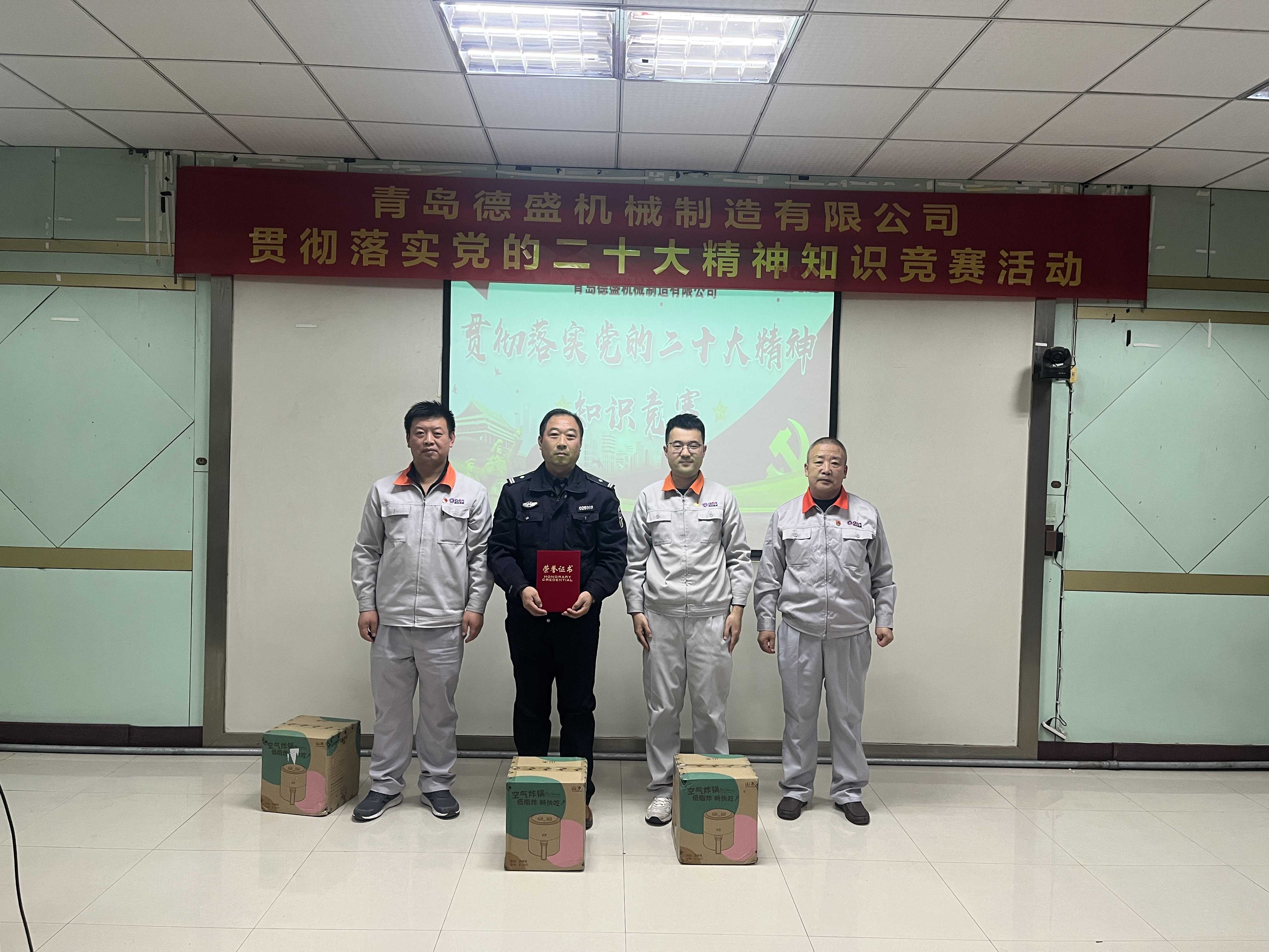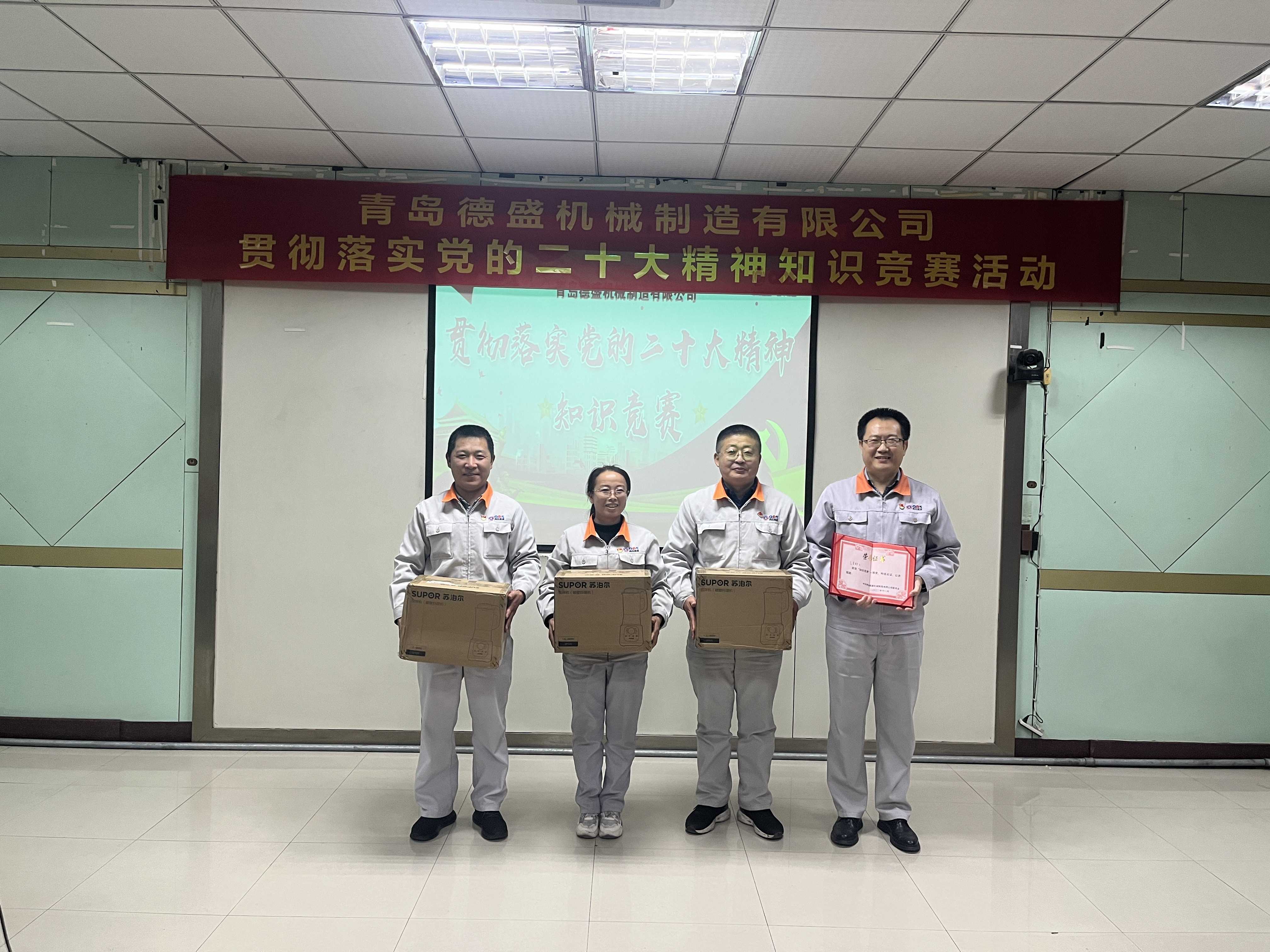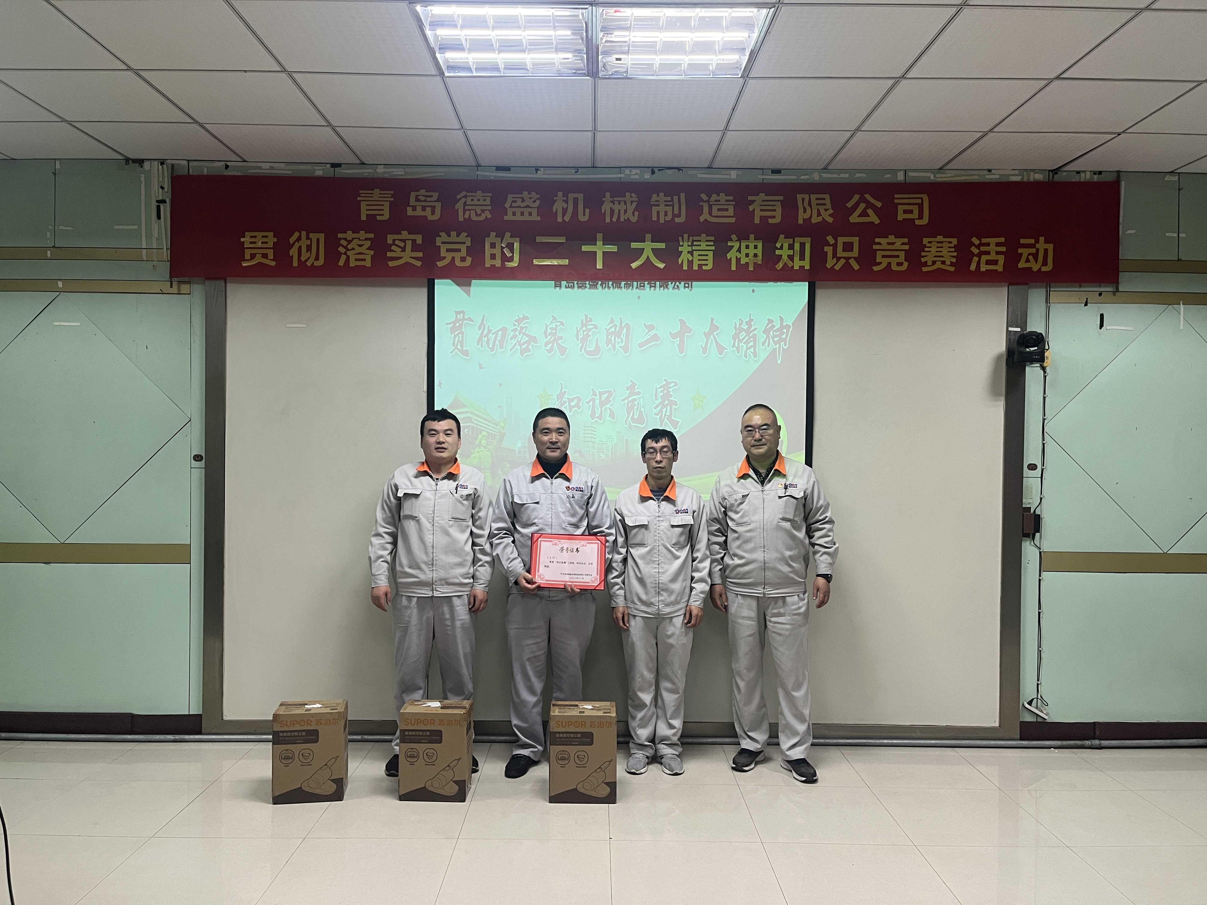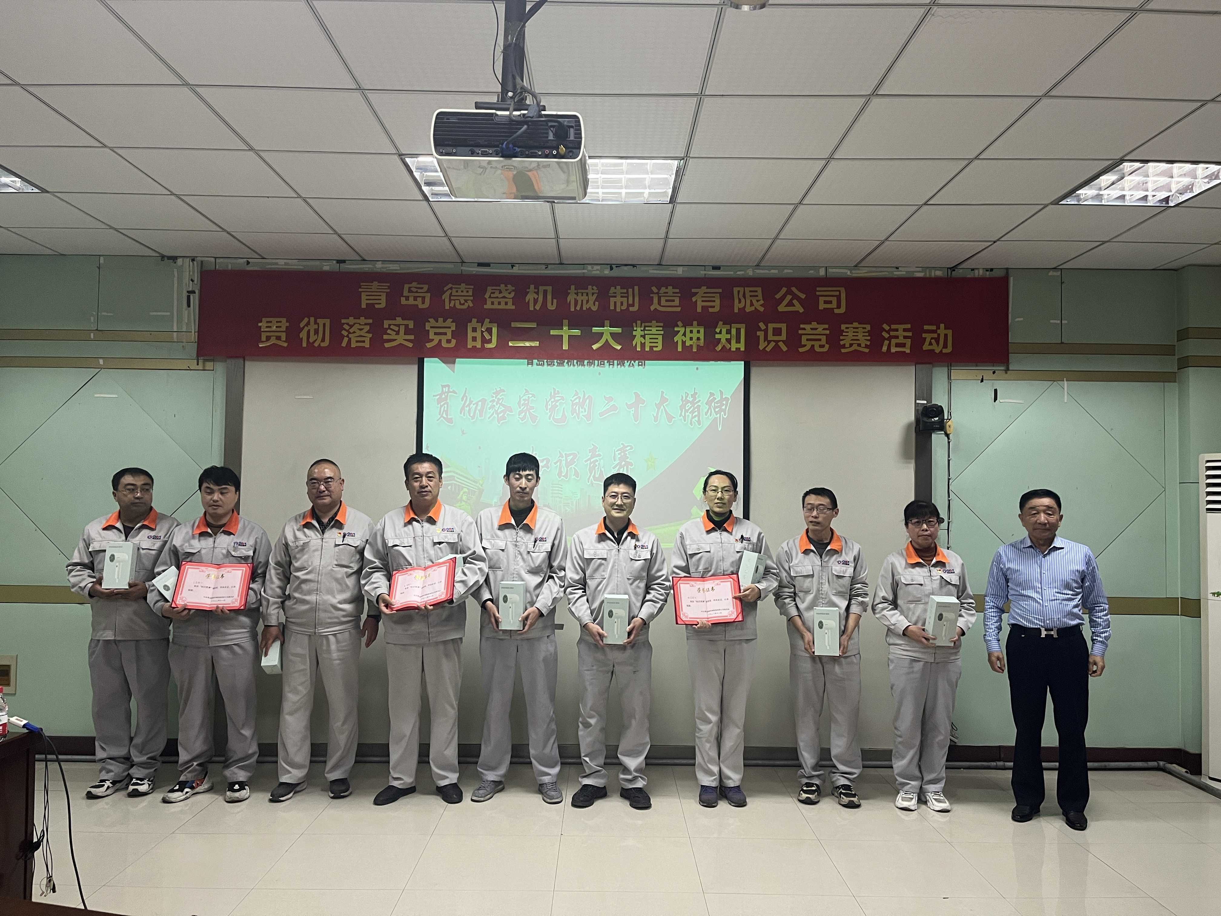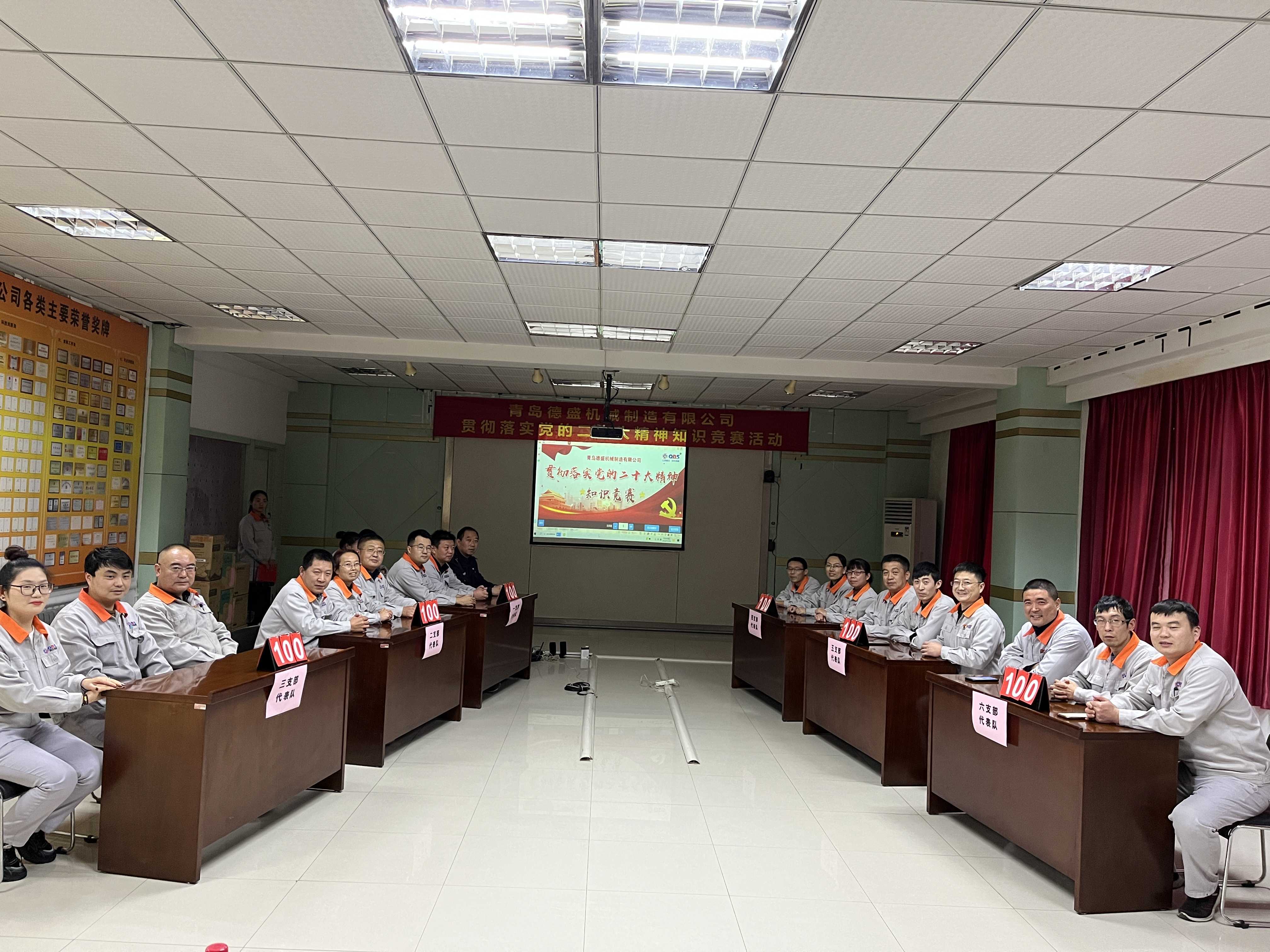 為熱烈慶祝黨的二十大勝利召開,深入貫徹落實黨的二十大精神,進一步推進公司黨員的思想、組織、作風建設(shè),不斷提高理論學習水平,踔厲奮發(fā)、勇毅前行。11月18日下午,中共青島德盛機械制造有限公司黨委組織開展了“貫徹落實黨的二十大精神”知識競賽活動。公司董事長孫佩璋,黨委書記、營銷和經(jīng)濟運行總監(jiān)羅賽,黨委副書記、黨政管理總監(jiān)李建平,黨委委員、董事長辦公室主任、黨政辦公室主任李超,黨委委員、總經(jīng)理助理、生產(chǎn)管理部經(jīng)理張錫軍,黨委委員、總經(jīng)理助理、技術(shù)研發(fā)中心主任王濤遠出席本次活動。